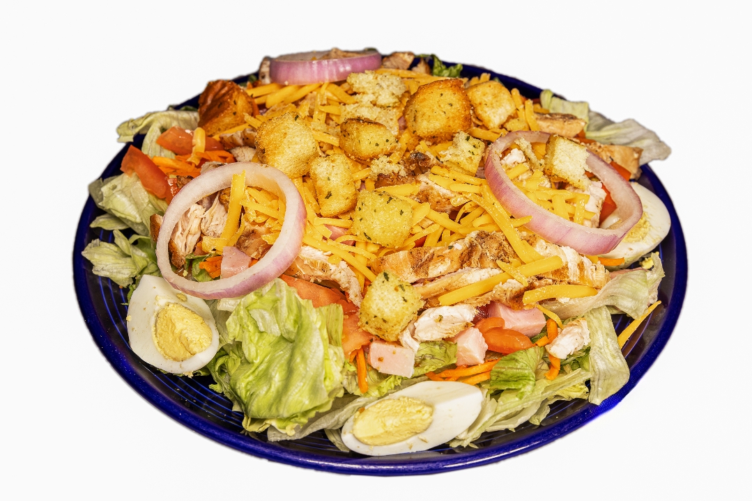 a bed of crisp lettuce loaded with chicken, ham, shredded cheese, eggs, tomato, and onion