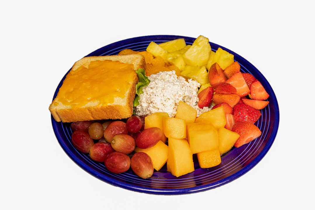 our made-from-scratch creamy chicken salad surrounded by an assortment of seasonal fresh fruit