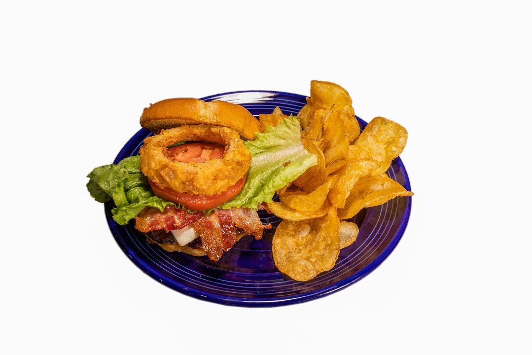 our Blue Plate cheeseburger with Monterey Jack cheese, crisp bacon, fried onion ring, and our homemade smoky BBQ sauce