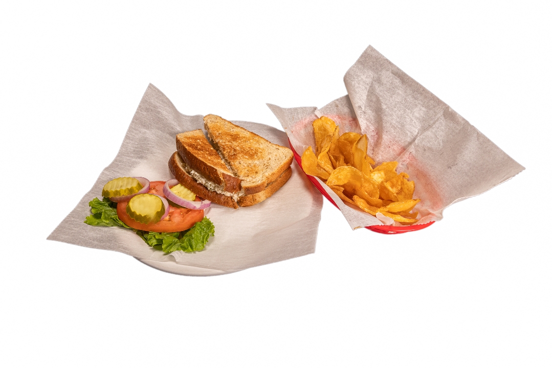 our made-from-scratch creamy chicken salad served on toasted wheat bread